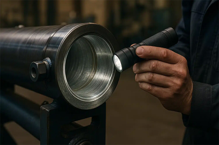 ใส่นิ้วที่สะอาดลงไปในกระบอกสูบและสัมผัสผนังด้านในเพื่อตรวจสอบ: รอยขีดข่วนใด ๆ ที่ลึกกว่า 0.5 มม. (เกี่ยวกับความหนาของเล็บมือ) จะทำให้เกิดปัญหาการปนเปื้อนของเหลวถาวร ในเวลาเดียวกันสังเกตว่าผนังด้านในของกระบอกสูบมีเส้นบดละเอียดสม่ำเสมอหรือไม่ หากมีจุดสว่างหรือร่องอาจเป็นสัญญาณของความเสียหายของลูกสูบ ก่อนที่จะสั่งซื้อชิ้นส่วนทดแทนคุณต้องควบคุมวิธีการวัดกระบอกไฮดรอลิกอย่างแม่นยำ